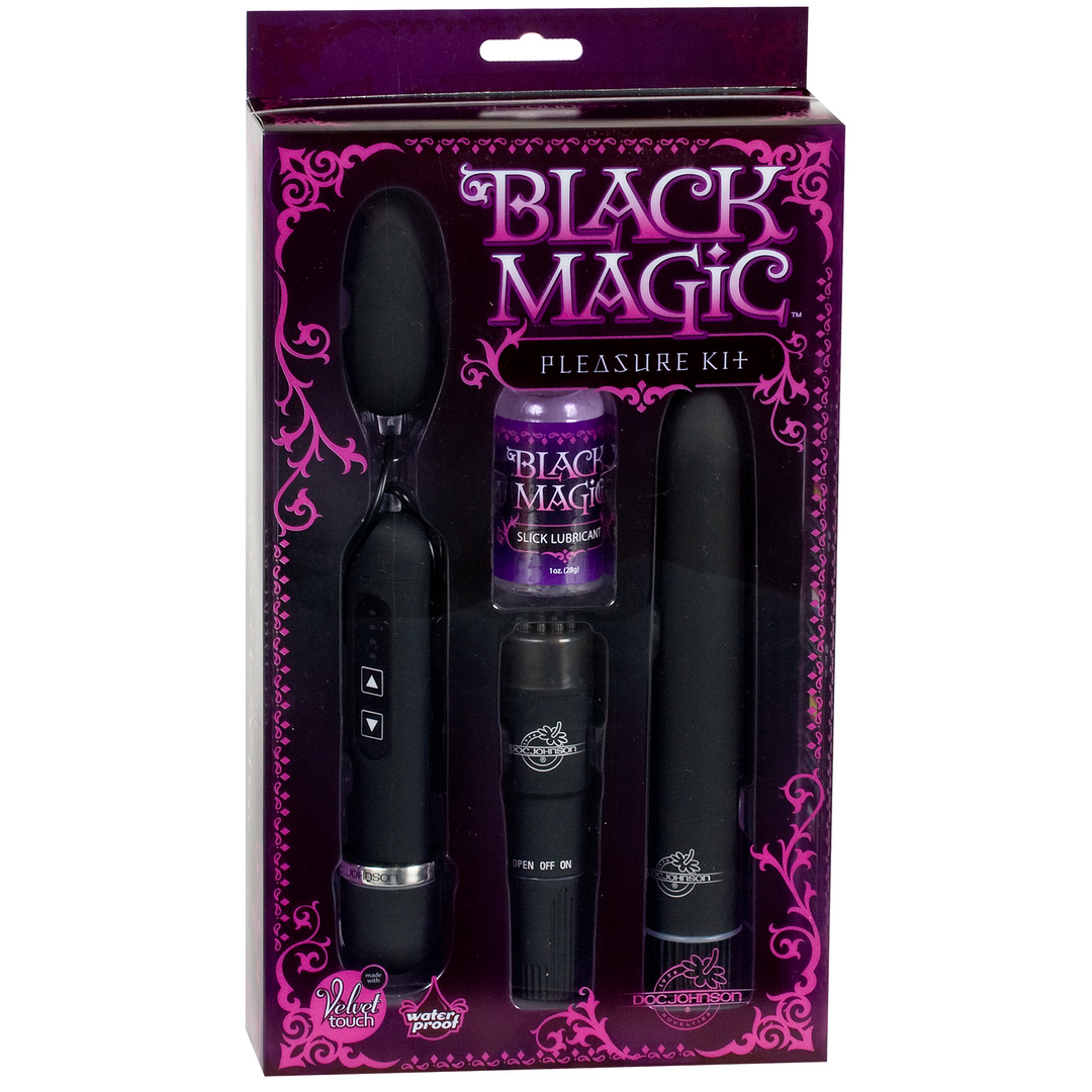 De Black Magic pleasure kit. Een indrukwekkende verzameling zijdezachte, zwarte vibrerende objecten die opwinden en verrukken. Begin met het openen van het heerlijke glijmiddel en activeer de Pocket Rocket voor clitorale bevrediging. De geribbelde kap versterkt de meeslepende sensaties. Ontdek de krachtige mogelijkheden met de ongelofelijke bullet/ei vibrator. Klassiek en elegant, de zeven-inch vibrator is een juweeltje in de hand. Draai de knop naar beneden om de gewenste snelheid te bereiken. Een trio van fluisterstille vibraties zal je verwachtingen overtreffen. Alle drie de vibrators zijn waterproof. Met genoeg trucjes om te delen, zal Black Magic je laten smeken om een toegift.